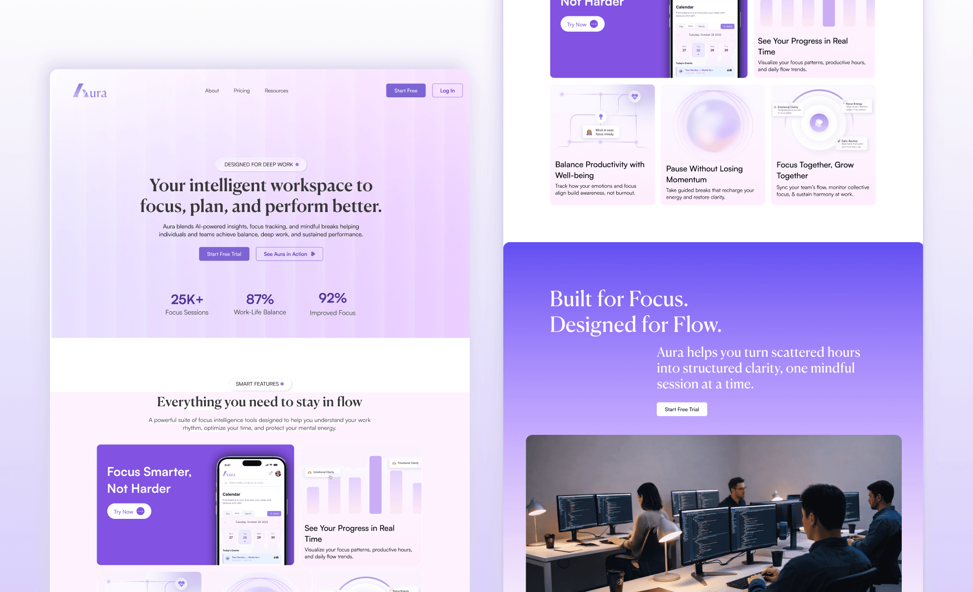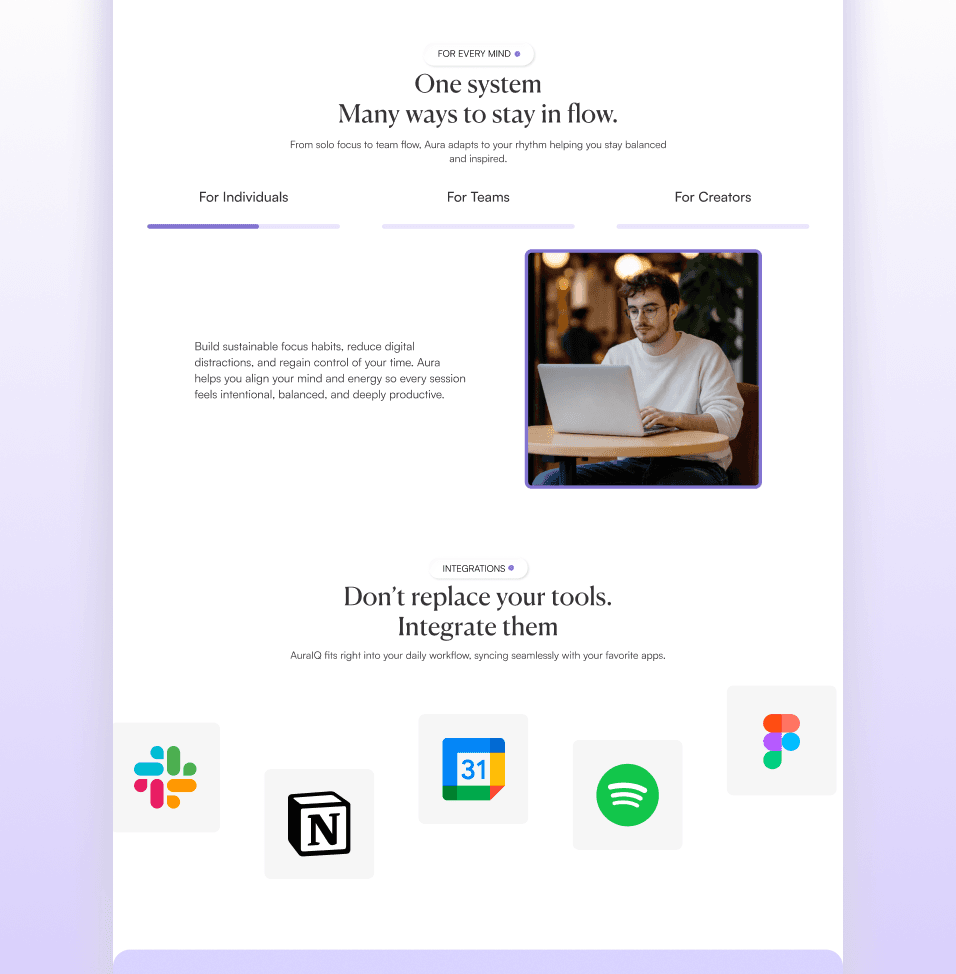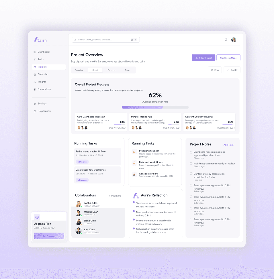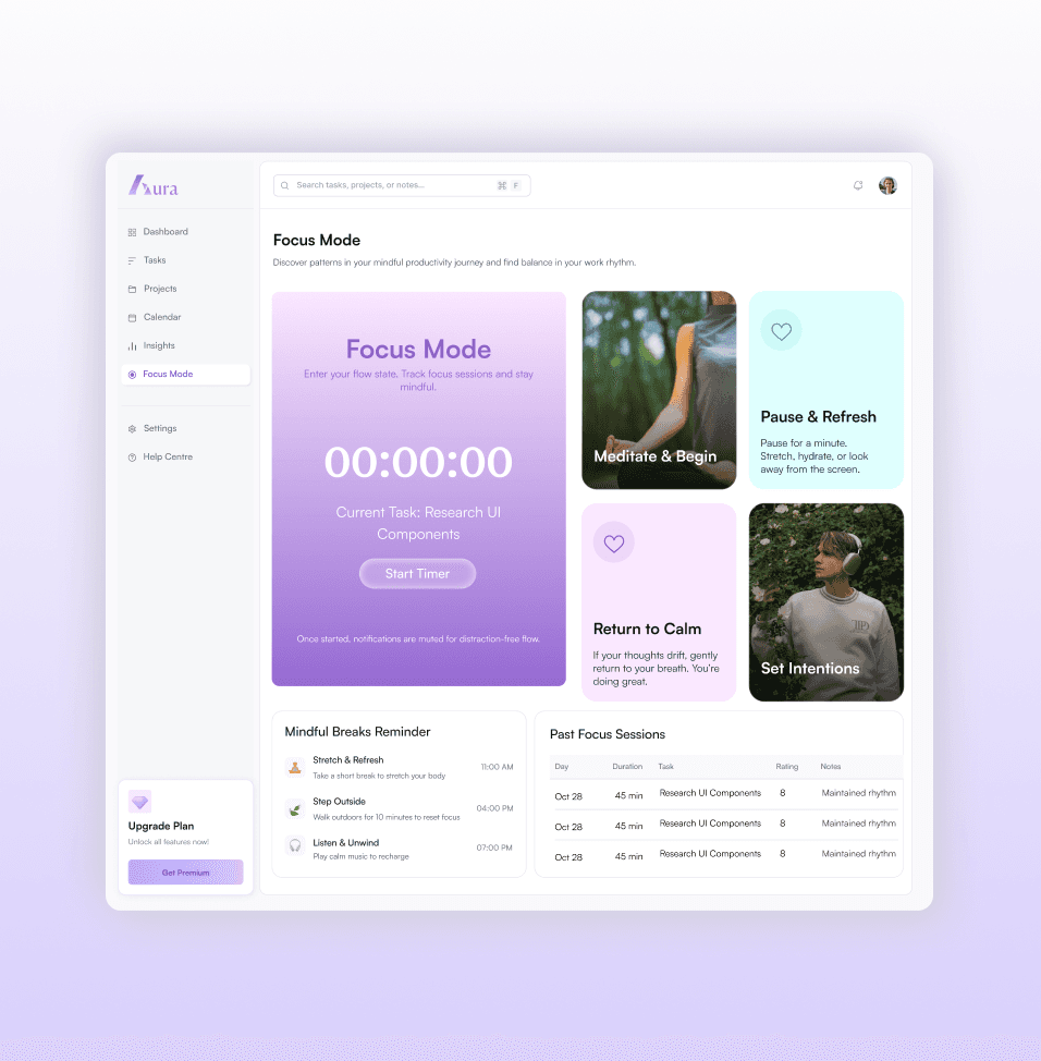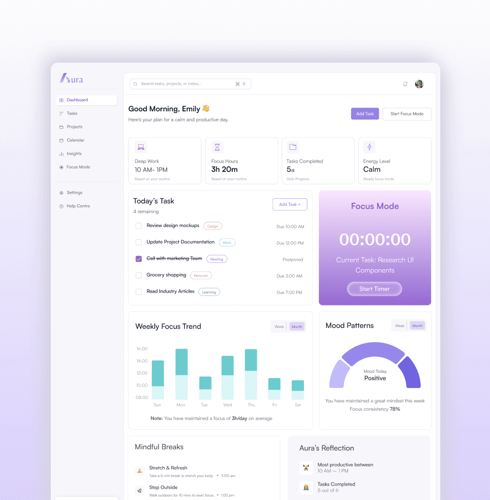 Aura is a productivity-focused digital platform designed to help individuals manage tasks, track focus sessions, and build better work habits. The product was designed from the ground up with a focus on clarity, minimalism, and intuitive workflows. The goal was to create a distraction-free environment that helps users stay organized while providing powerful tools for productivity and focus management.
